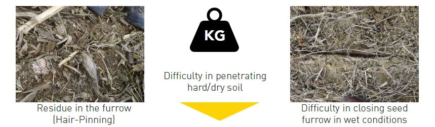 Cuando realizamos un análisis en el disco de doble ángulo, descubrimos que el requisito de presión hacia abajo era reducido y más manejable en comparación con la compactación del surco de semillas.